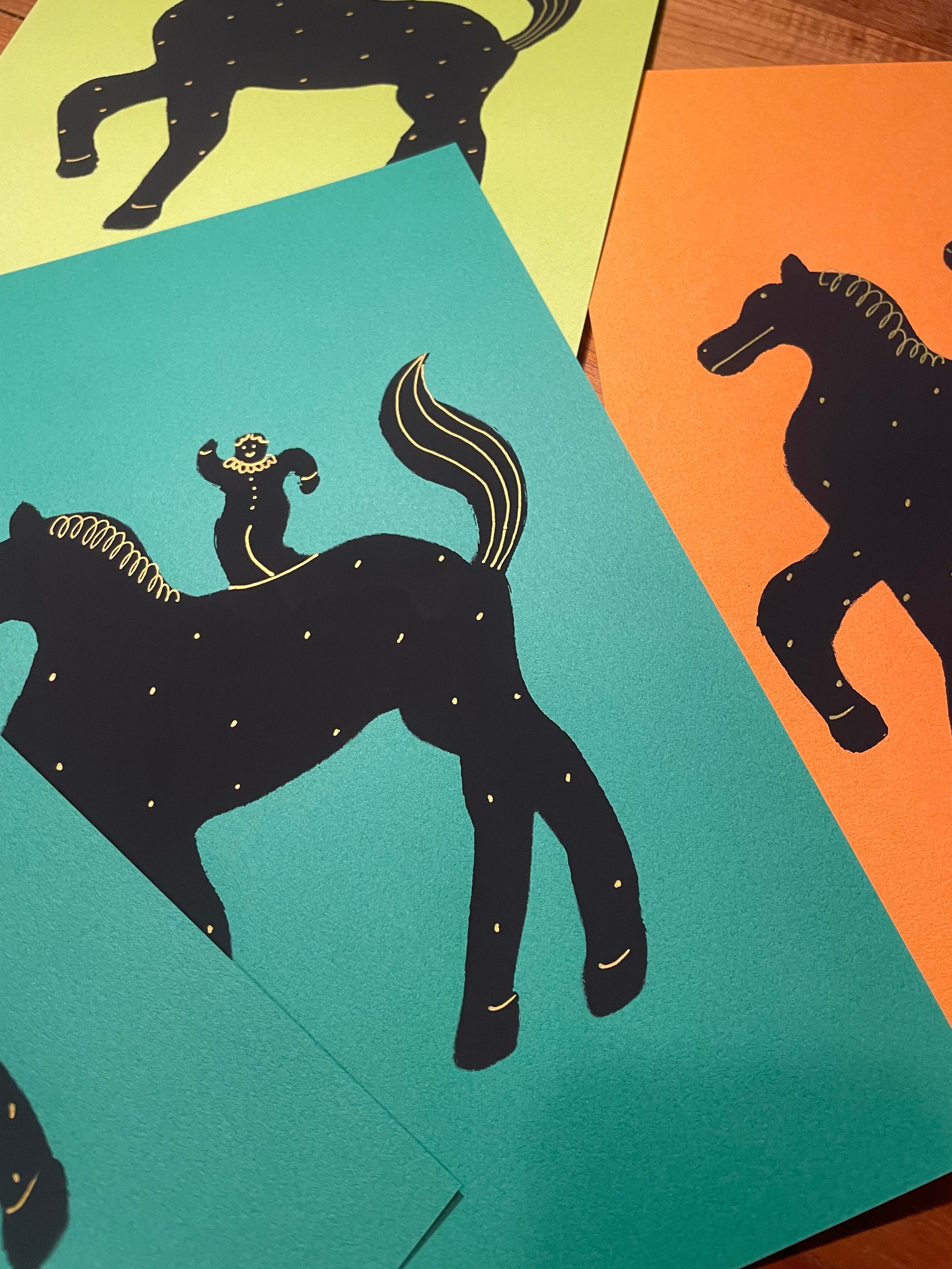 手刷りならではのインクの素朴でやわらかなマットな風合い、そして一枚ずつ描かれた金や銀の線の輝きが、静かに美しく紙の上にきらりと光ります。